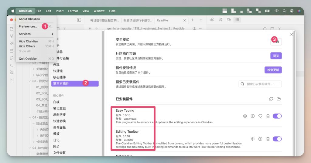 比如我自己常用的两个如下图,在设置/偏好–第三方插件里开启安全模式–然后去安装,更多其他插件推荐可以微信搜一搜、教程蛮丰富的,我就不赘述了;